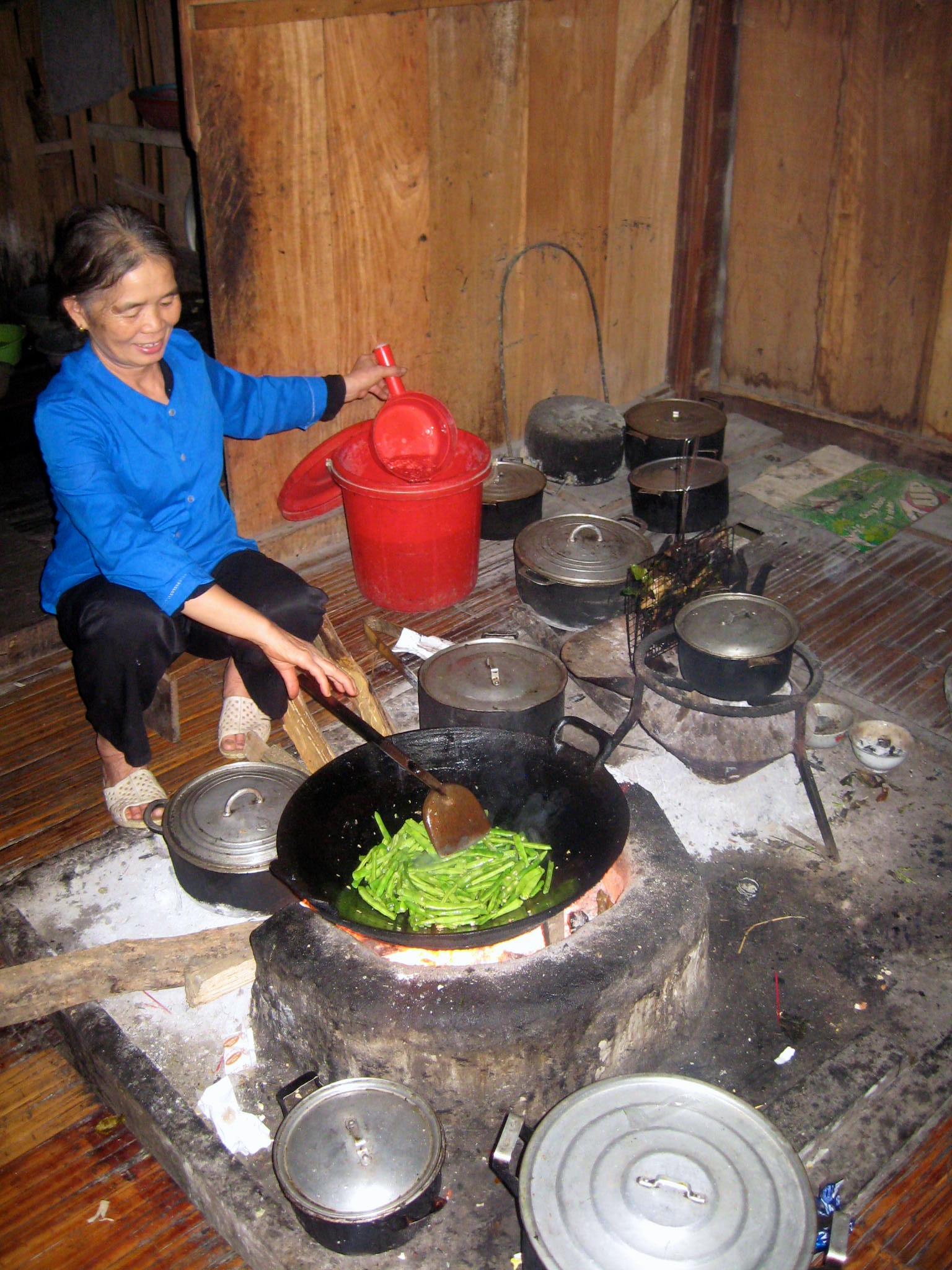 our meals are prepared over an open fire in the kitchen and we eat on a mat that is spread on the floor of the main room just for meal time. the food is fresh and delicious… spring rolls, fish, morning lories, shrimp, bamboo, greens, pork, and, of course, rice and soup (broth). meals in this quaint village are served with corn wine (in lieu of rice wine – corn wine can be made faster and cheaper). corn wine is strong … it tastes like grain alcohol. however, one can not be rude, so i drink. nancy and i both become quite agile with our chop sticks, although benh tells us we are not proficient until we can catch a mosquito in mid-air. hump!