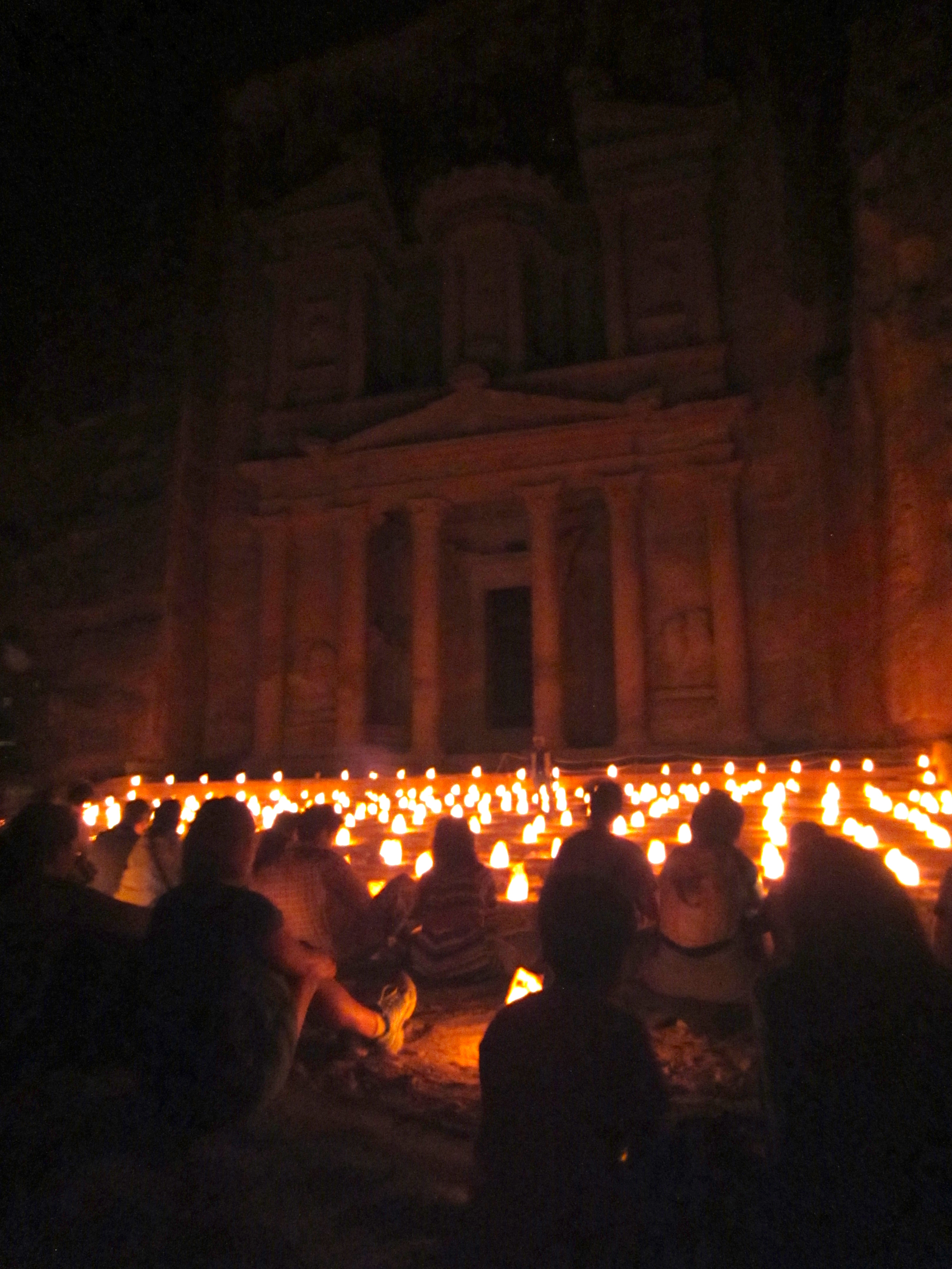 just after sunset we make our way to the gates of the ancient city of petra where we are greeted by droves of tourists and dozens of tour guides offering their services. the gate is busy and i am a bit concerned about the crowd. the walk down to the city is on a dirt, rocky path lined with candles in brown paper bags to light the way. i feel along carefully with my feet and try to stay close to my friend in the darkness. the long, winding walk through the siq opens up to the narrow canyon that is the entrance of petra and the view of the looming treasury illuminated by hundreds of brown bag candles on the ground in front. we are guided to straw mats lining the ground in front of the towering grecian temple. here we sit and are served tea while we listen as a bedouin plays the qanun (a traditional arabic string instrument), followed by a beautiful flute serenade. the evening is peaceful and serene, interrupted only by the occasional cry of a child or flash of a camera.
