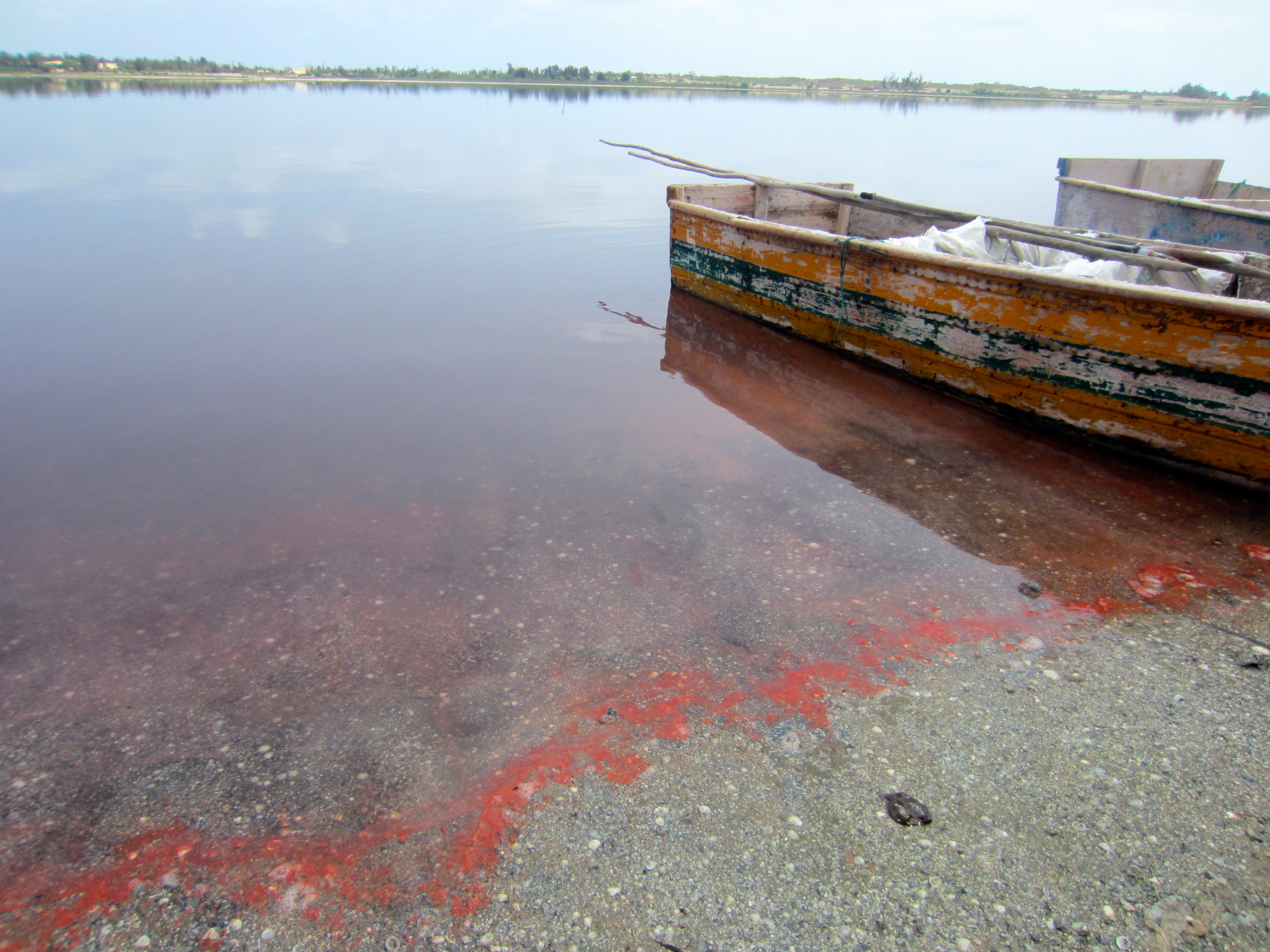 in the morning we meet babakar, a local tour guide, who i immediately like. he is tall and dark with long legs and an amazing smile. he is warm and friendly and his english (along with the five other languages he speaks) is excellent. we agree to spend three days touring the south of senegal with him. over the next few days babakar takes us to the bandia nature reserve for a “safari” where i stand less than 20 feet from two wild white rhinos and feel like a complete fool. in an open-air truck he takes us 2 hours to the northeast of dakar to lake retba or “lac rose” (pink lake) which really is pink due to an alge in the water that produces a reddish pigment using sunlight to create energy, thus turning the water pink. lake retba has an extremely high salt content and salt is “mined” here, we spend the afternoon wandering the hills of salt that are sitting out to dry and be cleaned for export.
