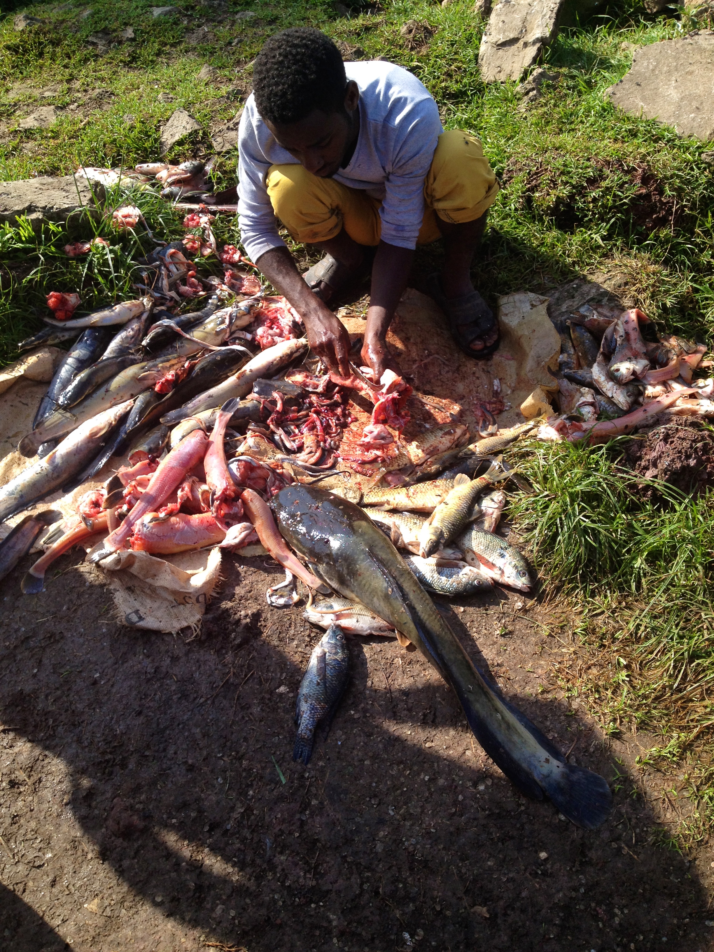 We arrive, late in the evening, at the town of Awassa, which is the capital of this region. Our hotel is situated beautifully overlooking a lake and is ripe with flowers and tropical plants. In the morning I wake to the sounds of birds calling, frogs croaking, and monkeys chattering. Heading to the fish market on the lake, we learn that Awassa is a town that thrives on agriculture and fishing. Watching the local men bring in nets overfilling with fish, we are surrounded by smells of mud, fresh lake water, the distinct odor of fish guts, and the amazing aroma of fish being cooked over open fire. The bird life is amazing, the lake is full of white pelicans and the shores are lined with marabou storks. Monkeys scavenge the ground for bits left by the children cleaning the fish, retreating to the nearest thatched rooftop with their prize.