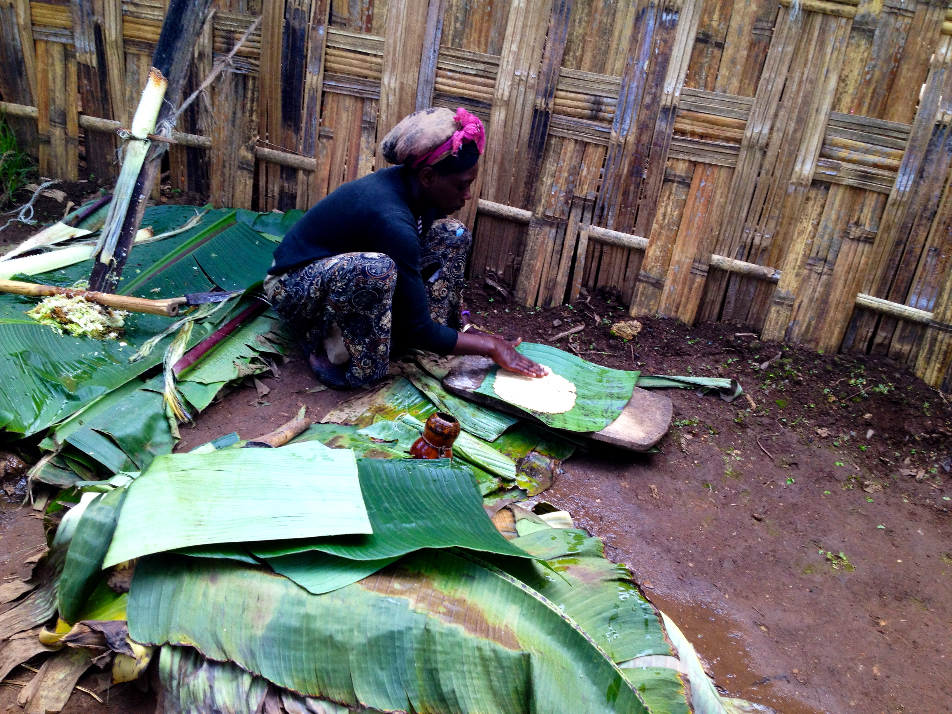 Next we head up the mountain to see the dorze people. Like most of the tribes we see in southern Ethiopia, these people rely completely on local resources for survival. The dorze people are famous for their weaving with natural fibers and dyes. Their homes are also something to behold – beehive shaped huts made of banana leaves that have doors and windows that resemble an elephant. The dorze homes are built in about three months and last upwards of 80 years. They have termite problems in the mountains. Their brilliant solution is to build their homes extra high, as the termites eat the layer nearest the ground, they simply cut it away and live termite free until the next layer is eaten … working with the termites this way, they are able to transform the uses of their homes over the 80+ years – from full family home, to newly married couple (childless) home, to children’s home, to kitchen – before the home is finally too short for use. Brilliant! Home recycling! I was not able to resist the weaving skills of this mountain tribe. The vibrant colors and intricate patterns create stunning results! The dorze people are ingenious farmers. Farming on a mountain side can be quite difficult considering the soil erosion due to deforestation and natural rainy seasons. However, this tribe has overcome this problem by terracing the lands of their mountains. The results are beautiful gardens along the mountainsides. A main food staple for this tribe is enset (also called ‘false banana’) – enset looks like a banana tree, but bears no fruit. The dorze have discovered that the bulb of the tree has fibers great for many uses. They use these fibers to make bread (a staple food) and an amazing ‘wine’. While I really enjoyed the enset bread with the delicious spices for dipping, the wine was more like moonshine – as it left my stomach on fire! Here we also had beer brewed of honey, which was thick, sweet, and delicious.