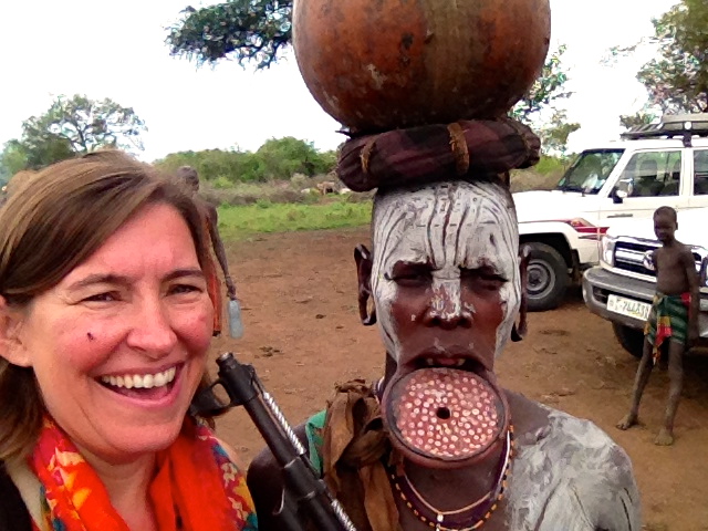 We visited the tribe of the mursi people. A beauty practice for the women of this tribe is to stretch the lower lip. Girls begin the practice at the onset of puberty by inserting a small ceramic disc into their lower lip. They slowly stretch the lip by routinely increasing the size of the disc. Soon the ladies have a lower lip that is stretched to the size of a small dinner plate! The mursi people live in the lowlands of southern Ethiopia, are an agricultural society, and practice animalist religions. They were the most curious of the tribes I met. While with the mursi people, I spent a great deal of time talking to two young men who knew a few words of English and were eager to learn more. We took time trading Amharic and English words, communicating through miming … complete with a great deal of laughter. as the entire tribe was mostly completely nude, I had hide my western shock when one of the young men took my breast in his hand to find the English word for this body part!